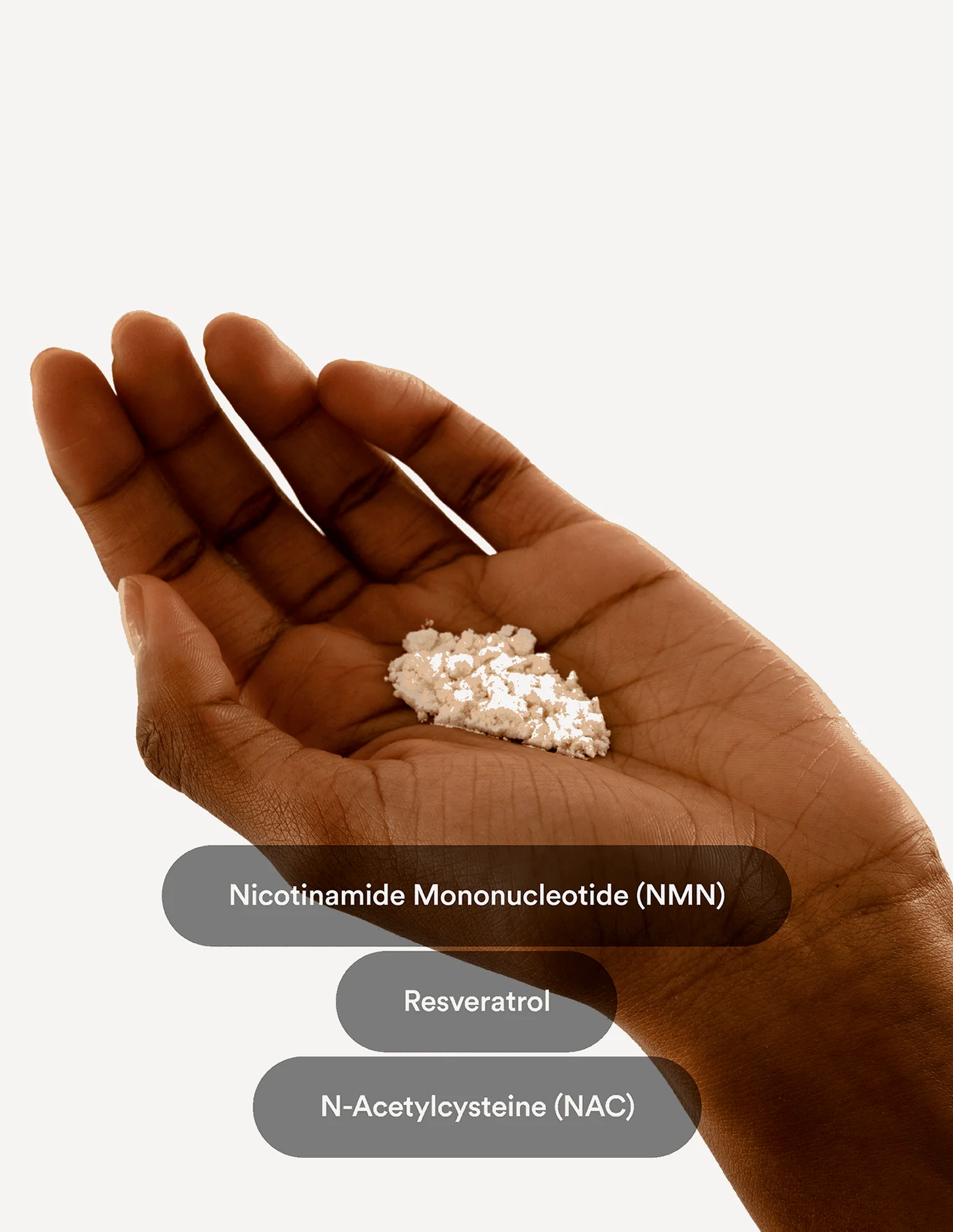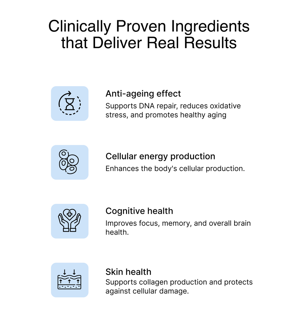 - Nicotinamide Mononucleotide (NMN): This foundational compound works to boost NAD+ levels in your cells, supporting DNA repair, mitochondrial health and smoother, more youthful skin.