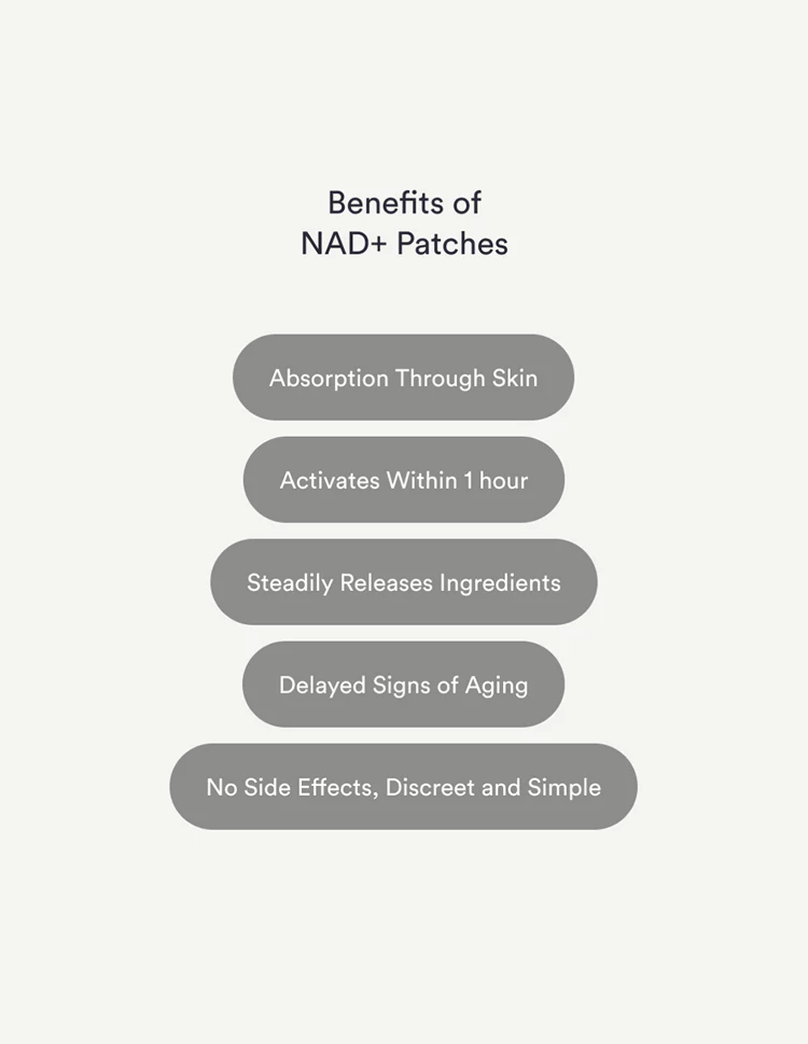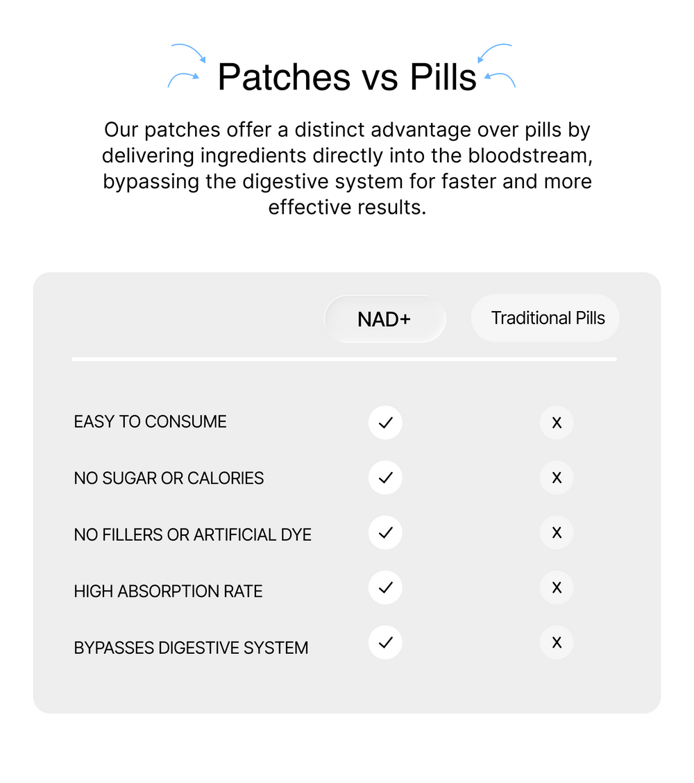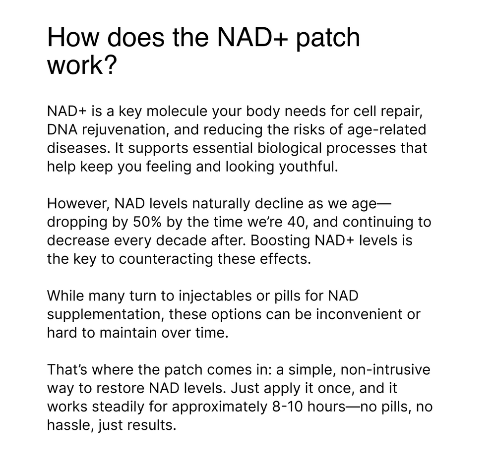 Wearable NAD+ patch that slows aging at the cellular level. Support skin elasticity, energy, and focus—all without pills or injections.
